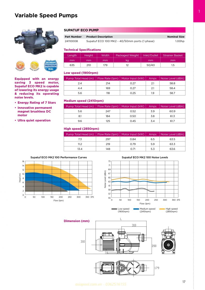 Bơm Supatuf eco MK2 có thể thay đổi tốc độ để phù hợp với các yêu cầu vận hành khác nhau của hồ bơi như rửa ngược, lọc, hút vệ sinh, đồng thời giảm năng lượng tiêu thụ .