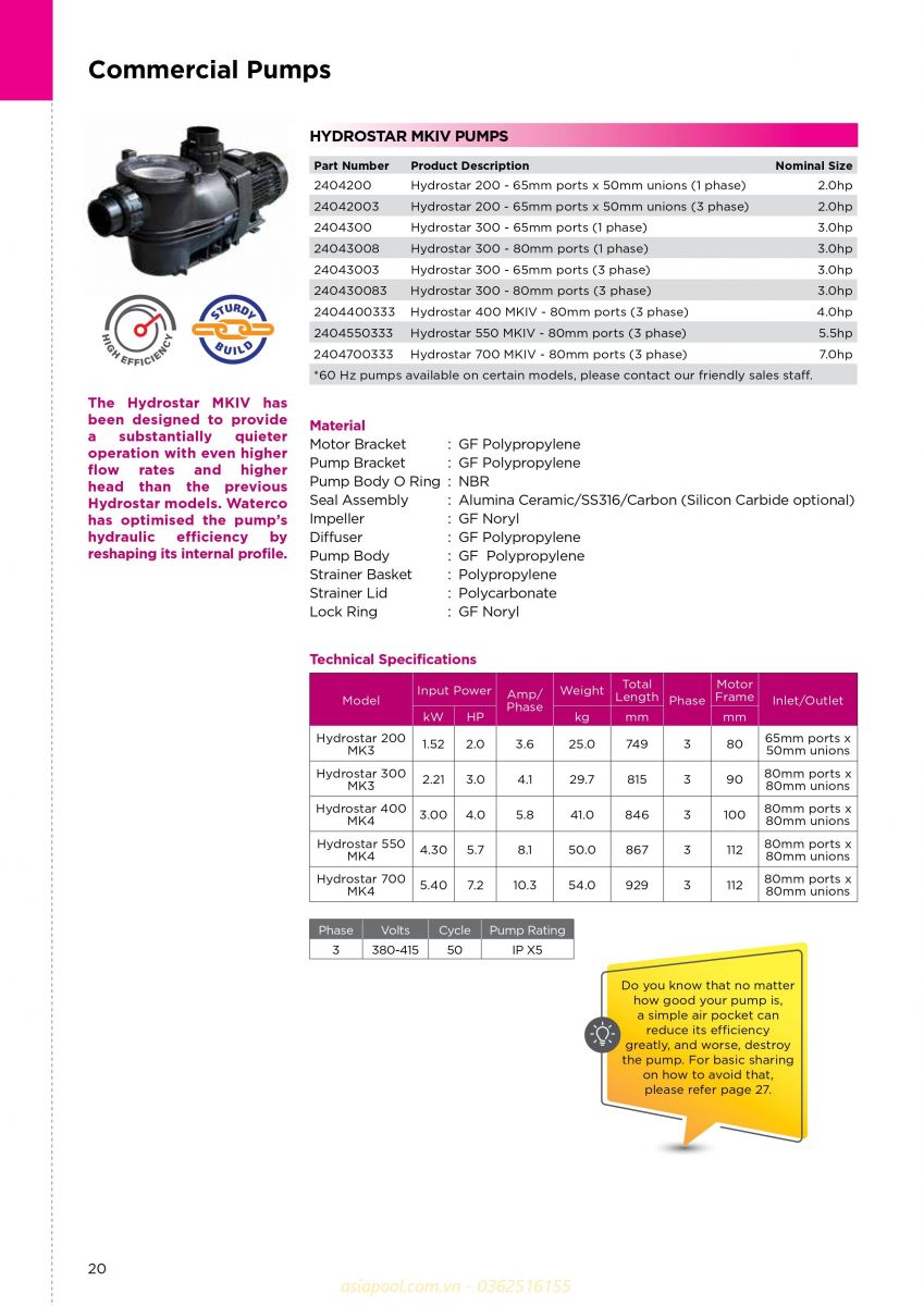 Bơm hydrostar được thiết kế có hiệu suất cao sử dụng làm bơm lọc, bơm hút bể massage, bơm tuần hoàn cho hệ gia nhiệt, đài phun… cho các bể bơi có dung tích trung bình lớn, chuyên cho các hồ bơi thương mại.