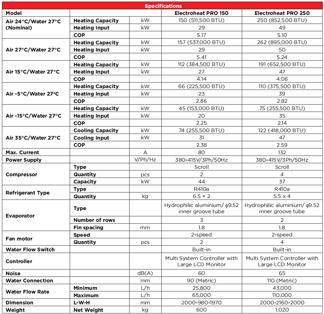 Electroheat Pro Heat Pumps được thiết kế để sử dụng cho các hồ bơi thương mại dung tích lớn hoặc các mục đích khác như phòng tắm, lavabo, nấu ăn…